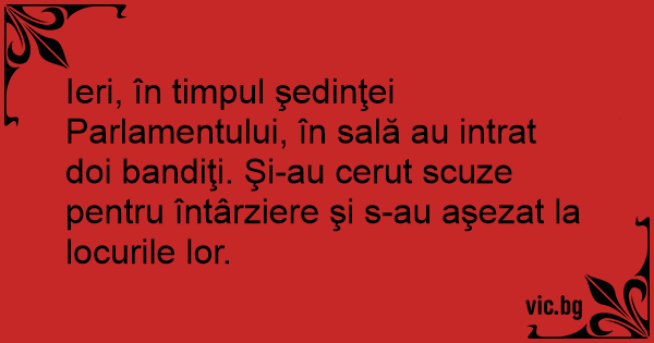 Ieri, în timpul şedinţei Parlamentului, în sală au intrat doi bandiţi. Şi-au cerut scuze pentru întârziere şi s-au aşezat la locurile lor.
