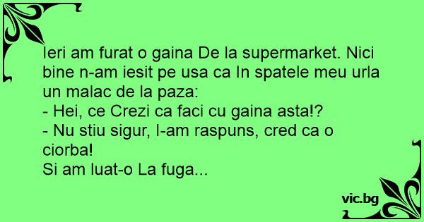 Ieri am furat o gaina De la supermarket. Nici bine n-am iesit pe usa ca In spatele meu urla un malac de la paza: