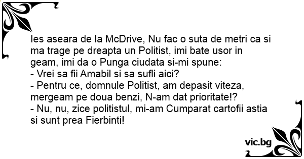 Ies aseara de la McDrive, Nu fac o suta de metri ca si ma trage pe dreapta un Politist, imi bate usor in geam, imi da o Punga ciudata si-mi spune: