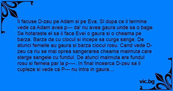 Ii facuse D-zeu pe Adam si pe Eva. Si dupa ce ii termina vede ca Adam avea p--- da' nu avea gaura unde sa o bage. Se hotaraste el sa ii faca Evei o gaura si o cheama pe barza. Barza da cu ciocul si incepe sa curga sange. De atunci femeile au gaura si barza ciocul rosu. Cand vede D-zeu ca nu se mai oprea sangerarea cheama maimuta care sterge sangele cu fundul. De atunci maimuta are fundul rosu si femeia par la p----. In final incearca D-zeu sa ii cupleze si vede ca P--- nu intra in gaura. Cheama stiuca si aceasta intra in gaura si o largeste. Si de aici dragii mei nu se mai stie ori p----miroase a stiuca ori stiuca miroase a p----