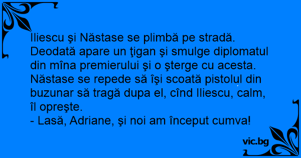 Iliescu şi Năstase se plimbă pe stradă. Deodată apare un ţigan şi smulge diplomatul din mîna premierului şi o şterge cu acesta. Năstase se repede să îşi scoată pistolul din buzunar să tragă dupa el, cînd Iliescu, calm, îl opreşte.