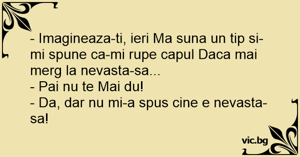 - Imagineaza-ti, ieri Ma suna un tip si-mi spune ca-mi rupe capul Daca mai merg la nevasta-sa...
