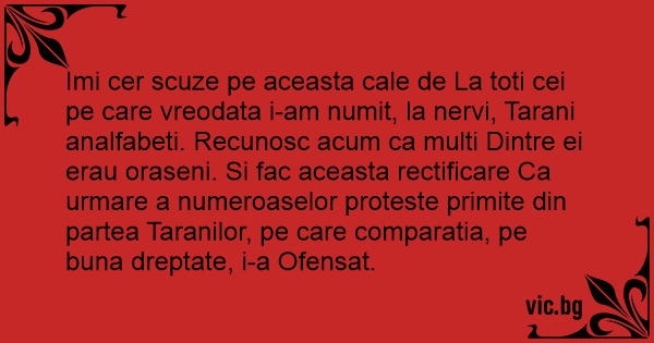 Imi cer scuze pe aceasta cale de La toti cei pe care vreodata i-am numit, la nervi, Tarani analfabeti. Recunosc acum ca multi Dintre ei erau oraseni. Si fac aceasta rectificare Ca urmare a numeroaselor proteste primite din partea Taranilor, pe care comparatia, pe buna dreptate, i-a Ofensat.