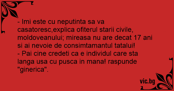 - Imi este cu neputinta sa va casatoresc,explica ofiterul starii civile, moldoveanului; mireasa nu are decat 17 ani si ai nevoie de consimtamantul tatalui!