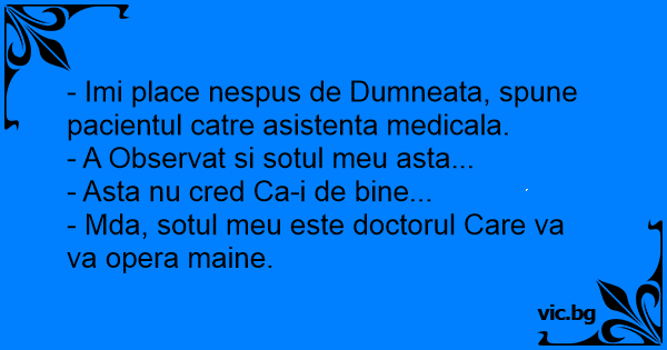 - Imi place nespus de Dumneata, spune pacientul catre asistenta medicala.