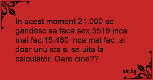 In acest moment 21.000 se gandesc sa faca sеx,5519 inca mai fac,15.480 inca mai fac ,si doar unu sta si se uita la calculator. Oare cine??