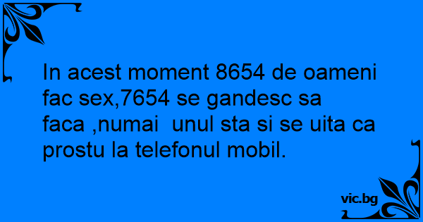 In acest moment 8654 de oameni fac sеx,7654 se gandesc sa faca ,numai unul sta si se uita ca prostu la telefonul mobil.