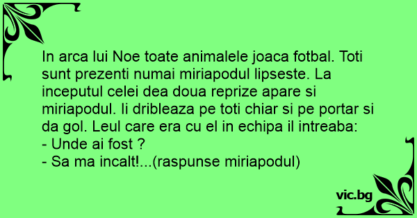 In arca lui Noe toate animalele joaca fotbal. Toti sunt prezenti numai miriapodul lipseste. La inceputul celei dea doua reprize apare si miriapodul. Ii dribleaza pe toti chiar si pe portar si da gol. Leul care era cu el in echipa il intreaba: