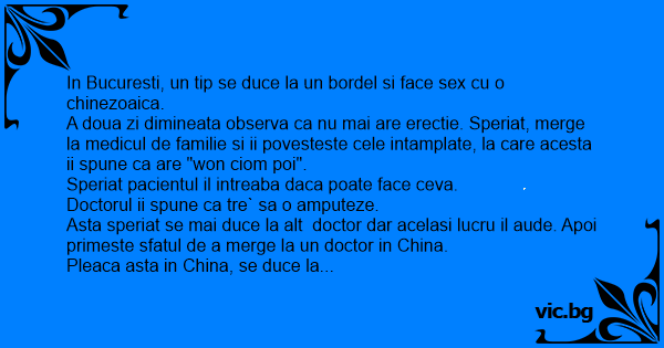 A doua zi dimineata observa ca nu mai are erectie. Speriat, merge la medicul de familie si ii povesteste cele intamplate, la care acesta ii spune ca are "won ciom poi".