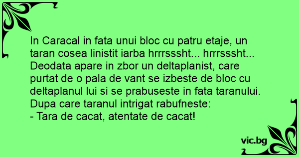 In Caracal in fata unui bloc cu patru etaje, un taran cosea linistit iarba hrrrsssht... hrrrsssht... Deodata apare in zbor un deltaplanist, care purtat de o pala de vant se izbeste de bloc cu deltaplanul lui si se prabuseste in fata taranului. Dupa care taranul intrigat rabufneste: