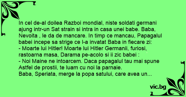 Baba, Speriata, merge la popa satului, care avea un papagal identic Si face schimb de papagali. A doua zi, vin germanii si se pun La masa. Papagalul tace. Ajung germanii la felul doi, papagalul Tace. Termina astia de mancat, papagalul tace.