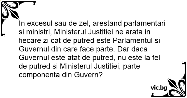 In excesul sau de zel, arestand parlamentari si ministri, Ministerul Justitiei ne arata in fiecare zi cat de putred este Parlamentul si Guvernul din care face parte. Dar daca Guvernul este atat de putred, nu este la fel de putred si Ministerul Justitiei, parte componenta din Guvern?