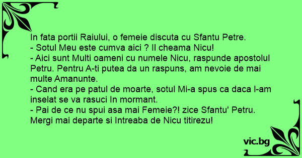 - Pai de ce nu spui asa mai Femeie?! zice Sfantu' Petru. Mergi mai departe si Intreaba de Nicu titirezu!