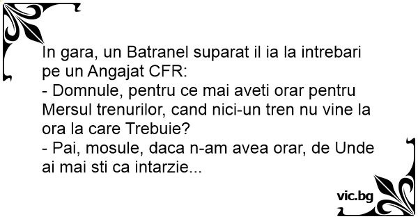 - Domnule, pentru ce mai aveti orar pentru Mersul trenurilor, cand nici-un tren nu vine la ora la care Trebuie?