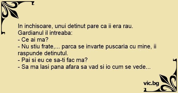 - Nu stiu frate,... parca se invarte puscaria cu mine, ii raspunde detinutul.