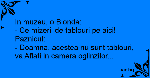 In muzeu, o Blonda:<br />- Ce mizerii de tablouri pe aici!<br />Paznicul:<br />- Doamna, acestea nu sunt tablouri, va Aflati in camera oglinzilor...