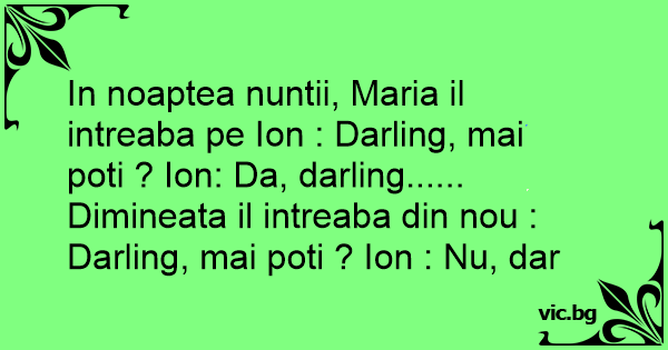 In noaptea nuntii, Maria il intreaba pe Ion : Darling, mai poti ? Ion: Da, darling...... Dimineata il intreaba din nou : Darling, mai poti ? Ion : Nu, dar ling.