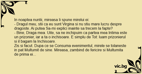 Zis si facut. Dupa ce se Consuma evenimentul, mirele se tolaneste in pat Multumit de sine. Mireasa, zambind de fericire si Multumita de prima ei experienta intima, Il anunta suav: