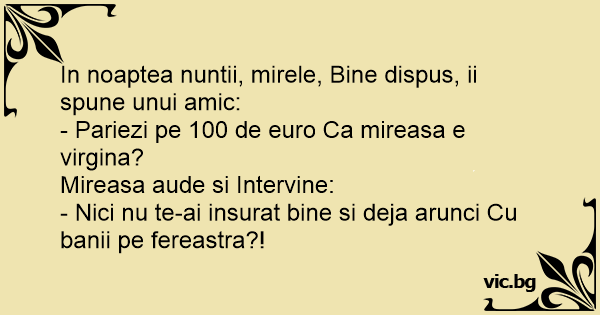 - Pariezi pe 100 de euro Ca mireasa e virgina?