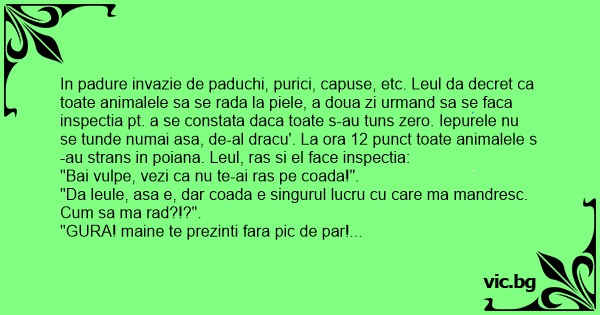 In padure invazie de paduchi, purici, capuse, etc. Leul da decret ca toate animalele sa se rada la piele, a doua zi urmand sa se faca inspectia pt. a se constata daca toate s-au tuns zero. Iepurele nu se tunde numai asa, de-al dracu'. La ora 12 punct toate animalele s-au strans in poiana. Leul, ras si el face inspectia:
