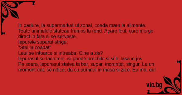 Pe seara, iepurasul statea la bar, supar, incruntat, singur. La un moment dat, se ridica, da cu pumnul in masa si zice: Eu ma, eu!