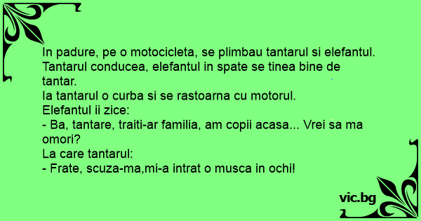 In padure, pe o motocicleta, se plimbau tantarul si elefantul.