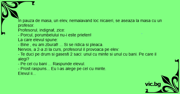 - Te duci pe drum si gasesti 2 saci: unul cu minte si unul cu bani. Pe care il alegi?