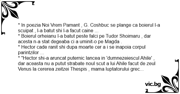 * "Hector shi-a aruncat puternic lancea in 'dumnezeiescul Ahile' , dar aceasta nu a putut strabate noul scut a lui Ahile facut de zeul Venus la cererea zeitzei Thespis , mama luptatorului grec .. Dupa aceea veni randul lui Ahile care slobozi greaua lui lance despre care Homer spunea ca numai el puteasa o invarta cu o singura mana care-l strapunsese pe Hector , cazut la pamant in acele putzine clipe pe care le mai avea de trait a putut observa ca zeitza Minerva il pacalise shi ii spusese cevala ureche lui Ahile ... ( teza , clasa a 9-a )