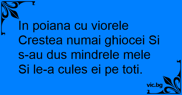 In poiana cu viorele Crestea numai ghiocei Si s-au dus mindrele mele Si le-a cules ei pe toti.