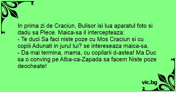 In prima zi de Craciun, Bulisor isi lua aparatul foto si dadu sa Plece. Maica-sa il intercepteaza: