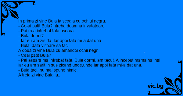 In prima zi vine Bula la scoala cu ochiul negru. - Ce-ai patit Bula?intreba doamna invatatoare. - Pai m-a intrebat tata aseara: - Bula dormi? - Iar eu am zis da. Iar apoi tata mi-a dat una. - Bula, data viitoare sa taci. A doua zi vine Bula cu amandoi ochii negrii. - Ceai patit Bula? - Pai aseara ma intrebat tata, Bula dormi, am tacut. A inceput mama hai,hai iar eu am sarit in sus zicand unde,unde iar apoi tata mi-a dat una. - Bula taci, nu mai spune nimic. A treia zi vine Bula la scoala cu gatul scrantit,picioarele rupte,mainile rupte si fata umflata. - Ce s-a intamplat Bula. - Pai m-a intrebat tata, Bula dormi, am tacut, a inceput mama hai,hai am tacut, a inceput tata hai,hai am tacut, a inceput mama ma mananca,ma mananca am tacut a inceput tata ma mananca,ma mananca, atunci na-m mai rezistat, am iesit pe balcon si am inceput sa strig: ajutor, astia ne mananca pe toti!asa am ajuns in halul asta.