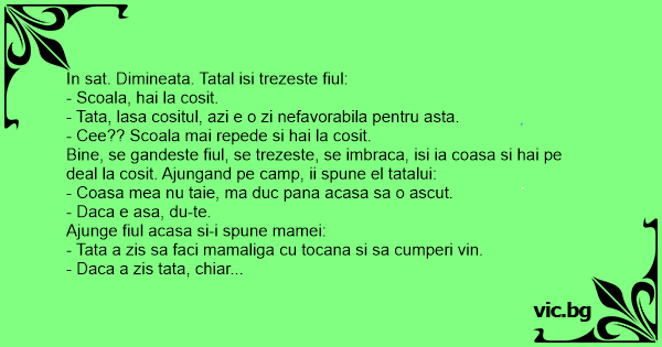 - Bine - zice fiul. Ia vinul, se intoarce acasa si-i spune tatalui: