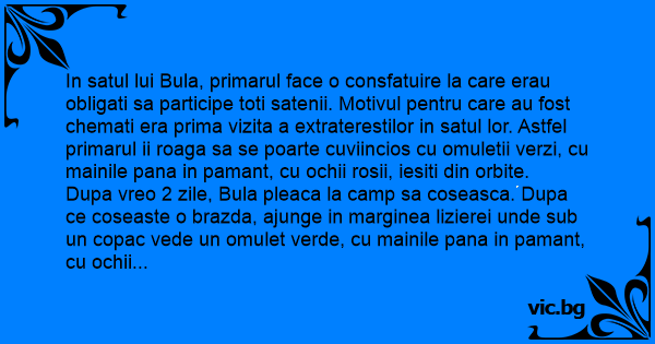 In satul lui Bula, primarul face o consfatuire la care erau obligati sa participe toti satenii. Motivul pentru care au fost chemati era prima vizita a extraterestilor in satul lor. Astfel primarul ii roaga sa se poarte cuviincios cu omuletii verzi, cu mainile pana in pamant, cu ochii rosii, iesiti din orbite.