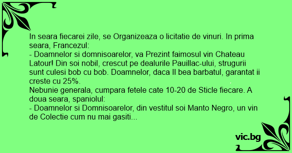 In seara fiecarei zile, se Organizeaza o licitatie de vinuri. In prima seara, Francezul: