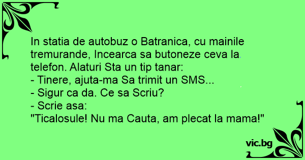 In statia de autobuz o Batranica, cu mainile tremurande, Incearca sa butoneze ceva la telefon. Alaturi Sta un tip tanar: