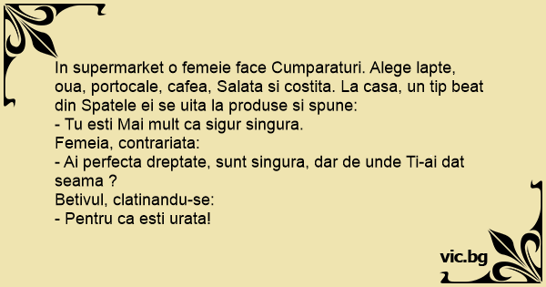 In supermarket o femeie face Cumparaturi. Alege lapte, oua, portocale, cafea, Salata si costita. La casa, un tip beat din Spatele ei se uita la produse si spune: