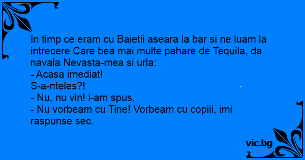 In timp ce eram cu Baietii aseara la bar si ne luam la intrecere Care bea mai multe pahare de Tequila, da navala Nevasta-mea si urla: