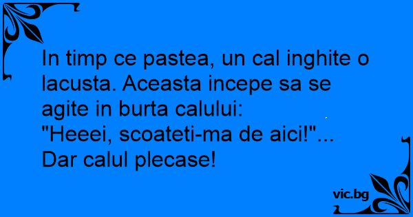 In timp ce pastea, un cal inghite o lacusta. Aceasta incepe sa se agite in burta calului: "Heeei, scoateti-ma de aici!"... Dar calul plecase!