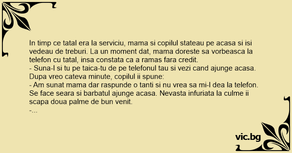 In timp ce tatal era la serviciu, mama si copilul stateau pe acasa si isi vedeau de treburi. La un moment dat, mama doreste sa vorbeasca la telefon cu tatal, insa constata ca a ramas fara credit.