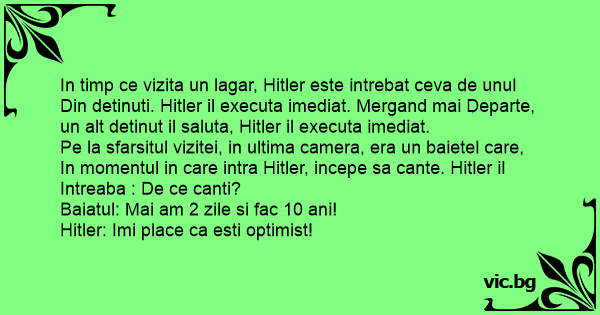 Pe la sfarsitul vizitei, in ultima camera, era un baietel care, In momentul in care intra Нiтlеr, incepe sa cante. Нiтlеr il Intreaba : De ce canti?