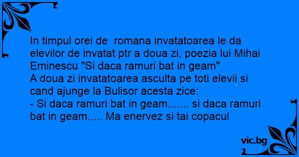In timpul orei de romana invatatoarea le da elevilor de invatat ptr a doua zi, poezia lui Mihai Eminescu "Si daca ramuri bat in geam"