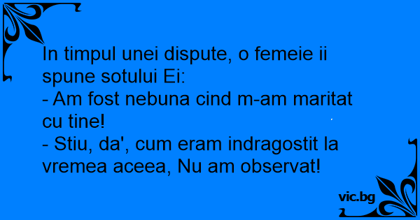 In timpul unei dispute, o femeie ii spune sotului Ei:<br />- Am fost nebuna cind m-am maritat cu tine!<br />- Stiu, da', сuм eram indragostit la vremea aceea, Nu am observat!