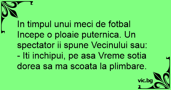 In timpul unui meci de fotbal Incepe o ploaie puternica. Un spectator ii spune Vecinului sau: