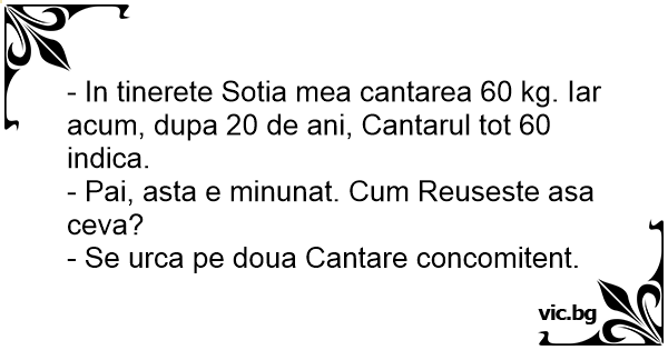 - In tinerete Sotia mea cantarea 60 kg. Iar acum, dupa 20 de ani, Cantarul tot 60 indica.