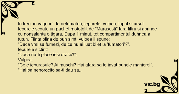 In tren, in vagonu' de nefumatori, iepurele, vulpea, lupul si ursul. Iepurele scoate un pachet mototolit de "Marasesti" fara filtru si aprinde cu nonsalanta o tigara. Dupa 1 minut, tot compartimentul duhnea a tutun. Fiinta plina de bun simt, vulpea ii spune: