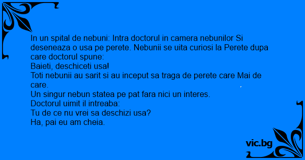 In un spital de nebuni: Intra doctorul in camera nebunilor Si deseneaza o usa pe perete. Nebunii se uita curiosi la Perete dupa care doctorul spune: