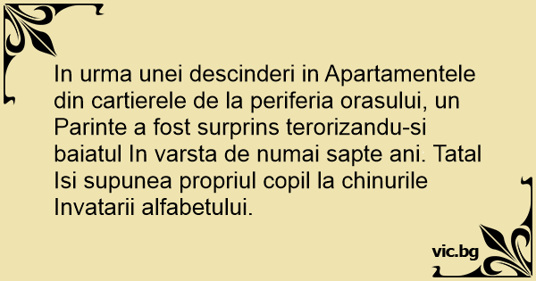In urma unei descinderi in Apartamentele din cartierele de la periferia orasului, un Parinte a fost surprins terorizandu-si baiatul In varsta de numai sapte ani. Tatal Isi supunea propriul copil la chinurile Invatarii alfabetului.