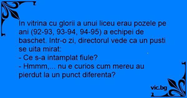 In vitrina cu glorii a unui liceu erau pozele pe ani (92-93, 93-94, 94-95) a echipei de baschet. Intr-o zi, directorul vede ca un pusti se uita mirat: