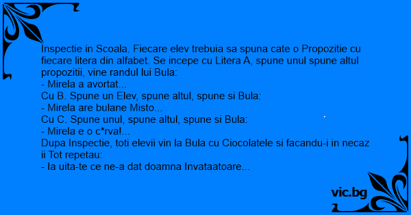 Inspectie in Scoala. Fiecare elev trebuia sa spuna cate o Propozitie cu fiecare litera din alfabet. Se incepe cu Litera A, spune unul spune altul propozitii, vine randul lui Bula: