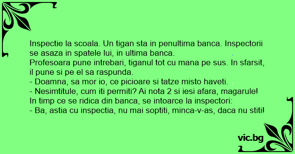 Inspectie la scoala. Un tigan sta in penultima banca. Inspectorii se asaza in spatele lui, in ultima banca.